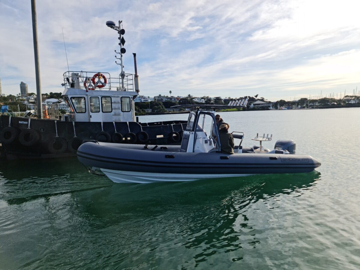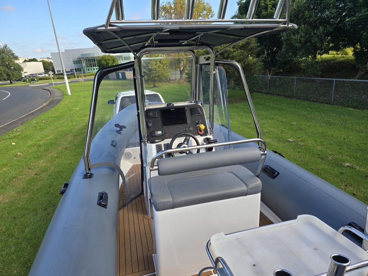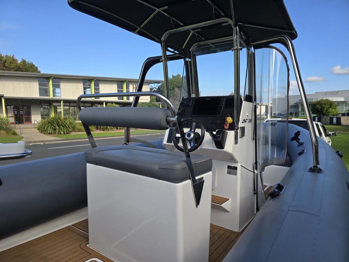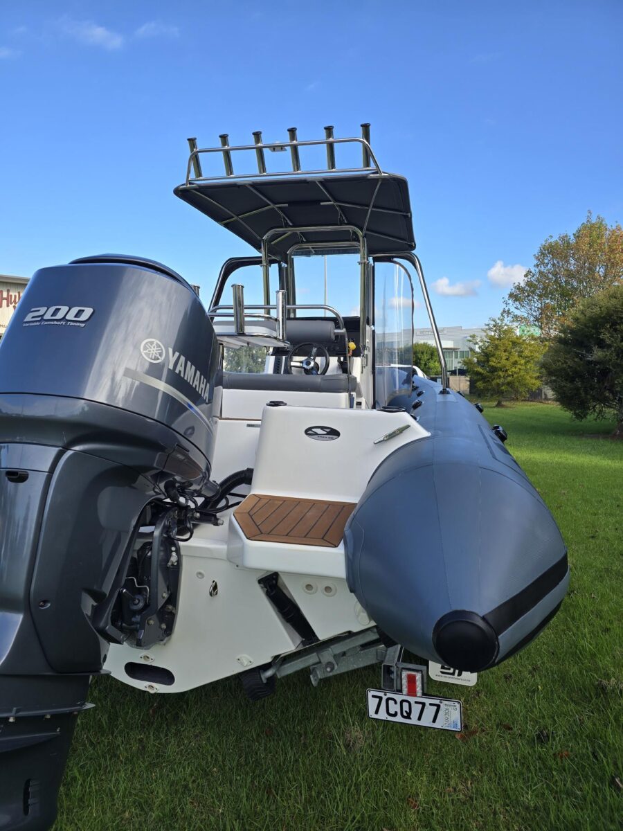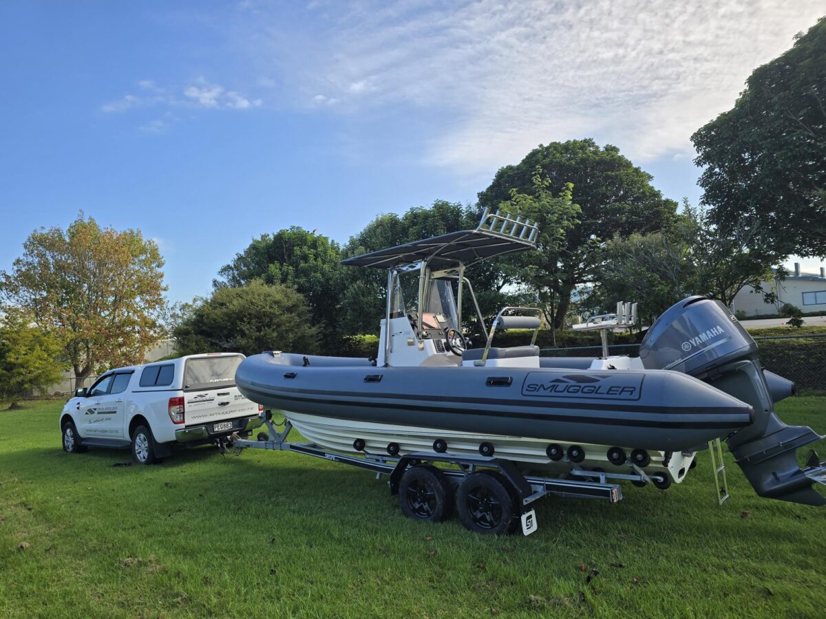 Fibreglass hull and liner 27 degree Smuggler signature hull, Gen 2 console with windscreen, carbon dash Large forward seat on console, stowage under Hypalon tubes, handles, double wear patches where required, repair kit, dual action pump, full manufacturer’s guarantee S/S fairlead on fibreglass support Built in 300 litre fuel tank (approx.) Raised forward seat and anchor locker Outboard well with 2x moulded aft seats upholstered Brass keel strip Towing eye Hydraulic steering S/S fuel filler Bilge pumps x2 Trim tabs 6-Way switch panels x2 Navigation lights, Anchor light Console light, cockpit lights Batteries x2, boxed, switch gear Compass UV resistant upholstery S/S Drink holders x2 Boarding ladder on transom Smuggler Graphics Double helmseat with reversible back rest, handle, aft facing foot rest Folding canvas T-Top with rocket launcher Side clears with S/S supports on console Simrad NSS12 Touchscreen Stereo – Fusion, 2x 6” Speakers VHF, aerial 12v / USB Outlet Camera fitted in bow Salt water wash down pump, hose etc Live bait tank Bait board with S/S surround and rod holders Ski pole (fits in bait board mount) Remote anchor winch with through bow anchor S/S Anchor with waterguard, chain, and warp Fire extinguisher fitted Extra rod holder x2 U-Dek flooring panels fitted Trailer – Multi roller, double axle, jockey wheel, registration and WOF