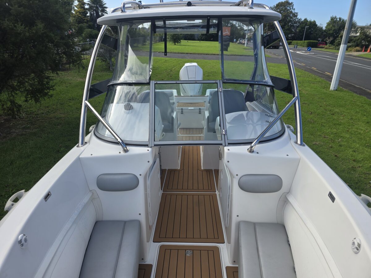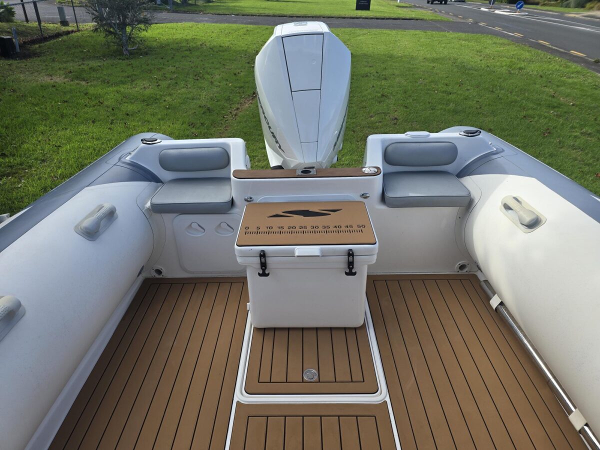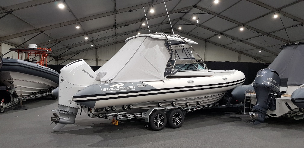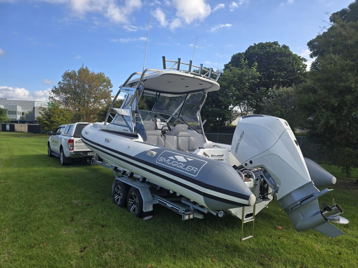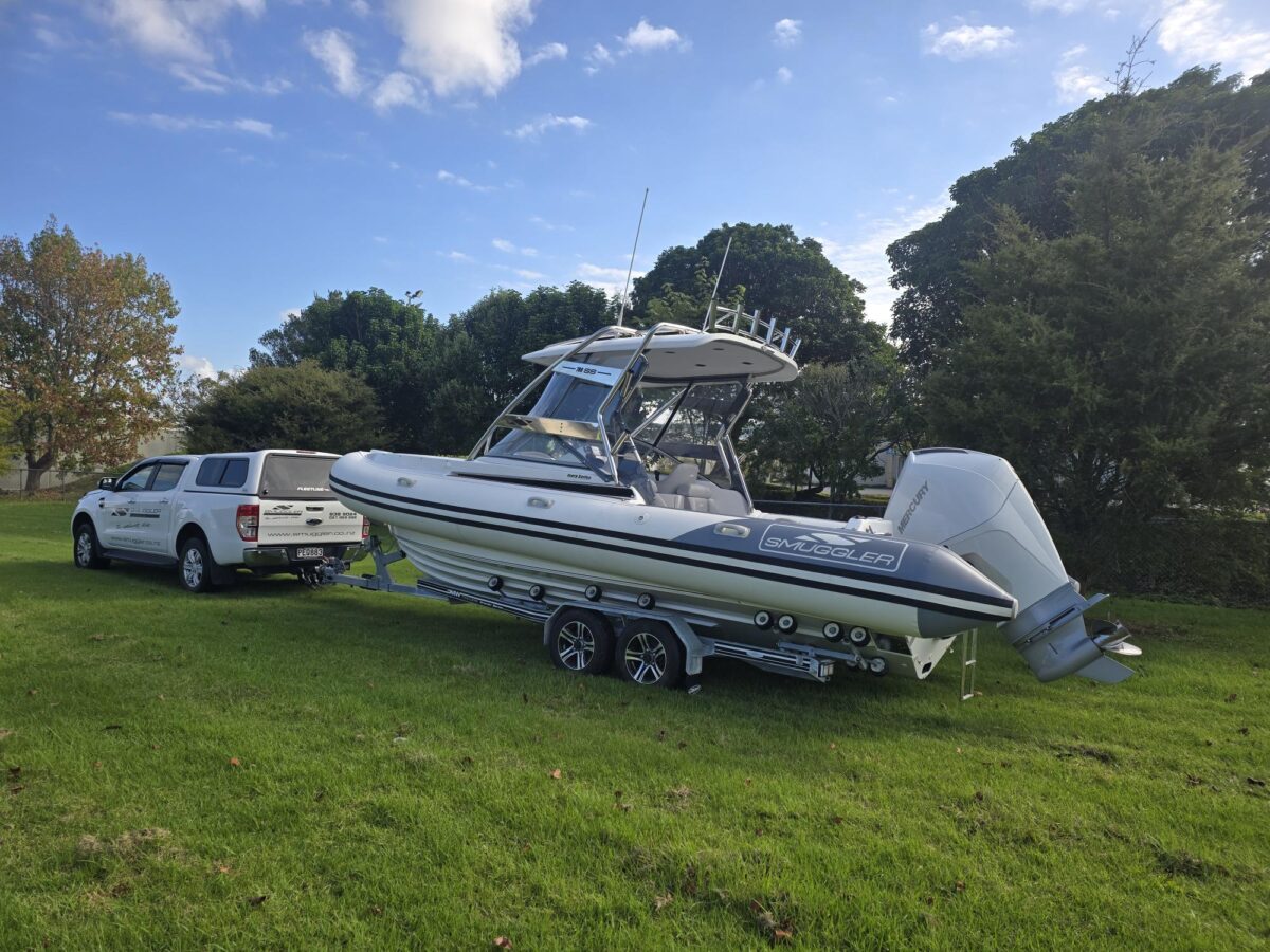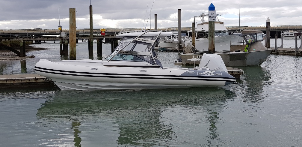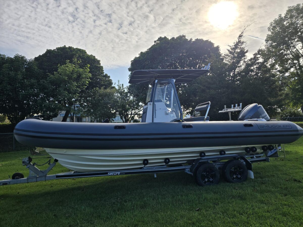Ivory Series Smuggler Super Sport 7.8metre boat, Fibreglass hull and liner, SuperSport Cabin walk through to fwd deck, Large forward seating area, Hypalon tubes, handles, double wear patches where required, repair kit, dual action pump, S/S fairlead on fibreglass support Built in 300 litre fuel tank (approx.) Raised forward seat and anchor locker Outboard well with 2x moulded aft seats upholstered Brass keel strip Towing eye Hydraulic steering S/S fuel filler Bilge pumps auto x2 Trim tabs 6-Way switch panels x2 Navigation lights Anchor light Cockpit lights, forward courtesy lights Batteries x2, boxed, switch gear Compass Silvertex upholstery Boarding ladder Built in Glove box Smuggler Graphics Seating King queen back to back x2 Sport Hardtop Clears for Sport hardtop Backdrop Bow cover with wooden bows Wind protection cover between consoles and bottom of windscreen All over cover custom fitted Simrad NSS12 Stereo – Fusion, speakers x4 VHF, aerial 12v Outlet Fixed floodlight on bimini Camera fitted in bow for anchoring Salt water wash down pump, hose etc Live bait tank Bait board with S/S surround and rod holders Remote anchor winch with through bow anchor Anchor, chain15m and warp 70m Fire extinguisher fitted Extra rod holders Ultralon Decking panels fitted – teak look Rocket launcher on hardtop DMW Multi roller, double axle, hydraulic brakes S/S, jockey wheel