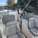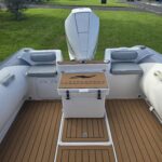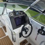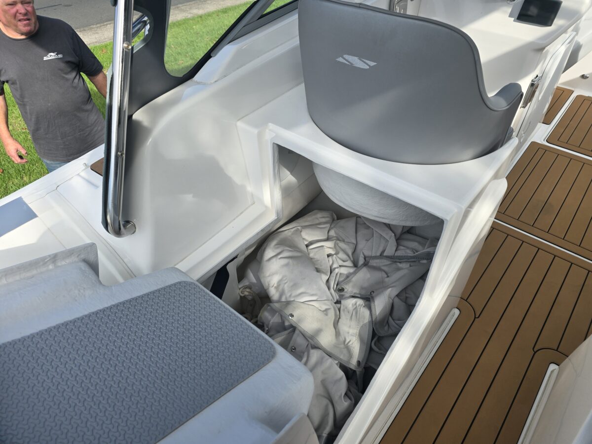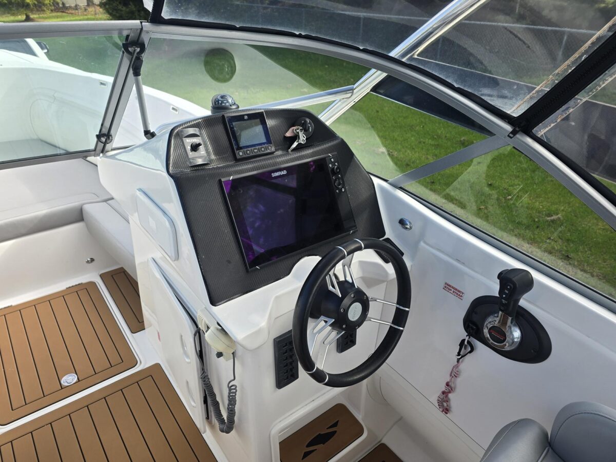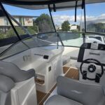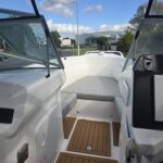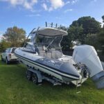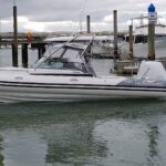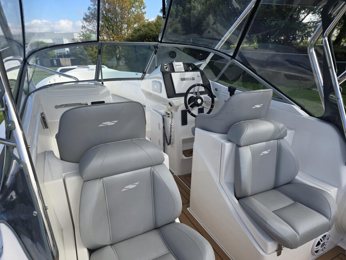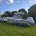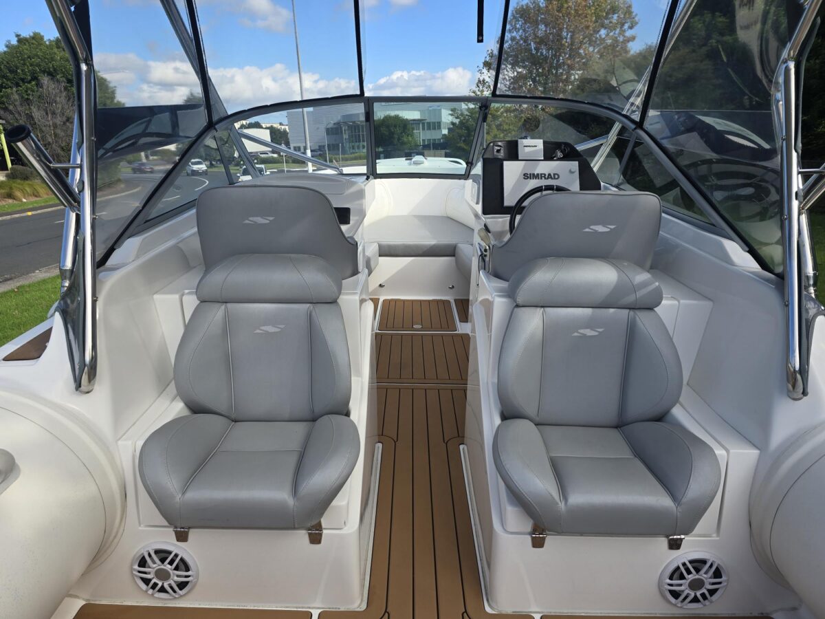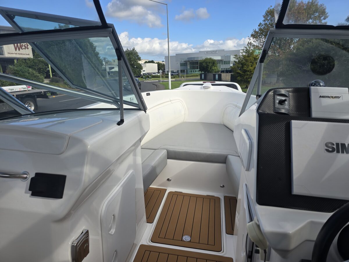 Ivory Series Smuggler Super Sport 7.8metre boat, Fibreglass hull and liner, SuperSport Cabin walk through to fwd deck, Large forward seating area, Hypalon tubes, handles, double wear patches where required, repair kit, dual action pump, S/S fairlead on fibreglass support Built in 300 litre fuel tank (approx.) Raised forward seat and anchor locker Outboard well with 2x moulded aft seats upholstered Brass keel strip Towing eye Hydraulic steering S/S fuel filler Bilge pumps auto x2 Trim tabs 6-Way switch panels x2 Navigation lights Anchor light Cockpit lights, forward courtesy lights Batteries x2, boxed, switch gear Compass Silvertex upholstery Boarding ladder Built in Glove box Smuggler Graphics Seating King queen back to back x2 Sport Hardtop Clears for Sport hardtop Backdrop Bow cover with wooden bows Wind protection cover between consoles and bottom of windscreen All over cover custom fitted Simrad NSS12 Stereo – Fusion, speakers x4 VHF, aerial 12v Outlet Fixed floodlight on bimini Camera fitted in bow for anchoring Salt water wash down pump, hose etc Live bait tank Bait board with S/S surround and rod holders Remote anchor winch with through bow anchor Anchor, chain15m and warp 70m Fire extinguisher fitted Extra rod holders Ultralon Decking panels fitted – teak look Rocket launcher on hardtop DMW Multi roller, double axle, hydraulic brakes S/S, jockey wheel