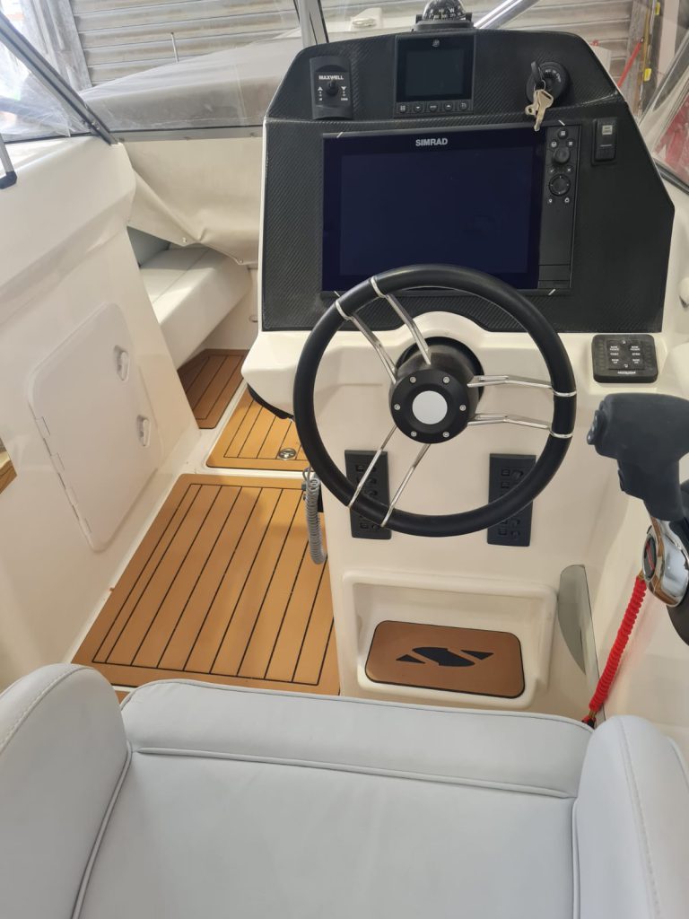 This 780 Super Sport is also fitted with a load of electrical options including a Simrad NSS12 Touch plotter/sounder, Fusion stereo with 2 x 6” speakers, VHF, forward facing light bar and floodlight, LED underwater lighting on transom and a camera fitted in the bow for ease of anchoring.
